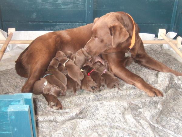 Her er den trætte mor med 9 hvalpe – 5 hanner og 4 tæver